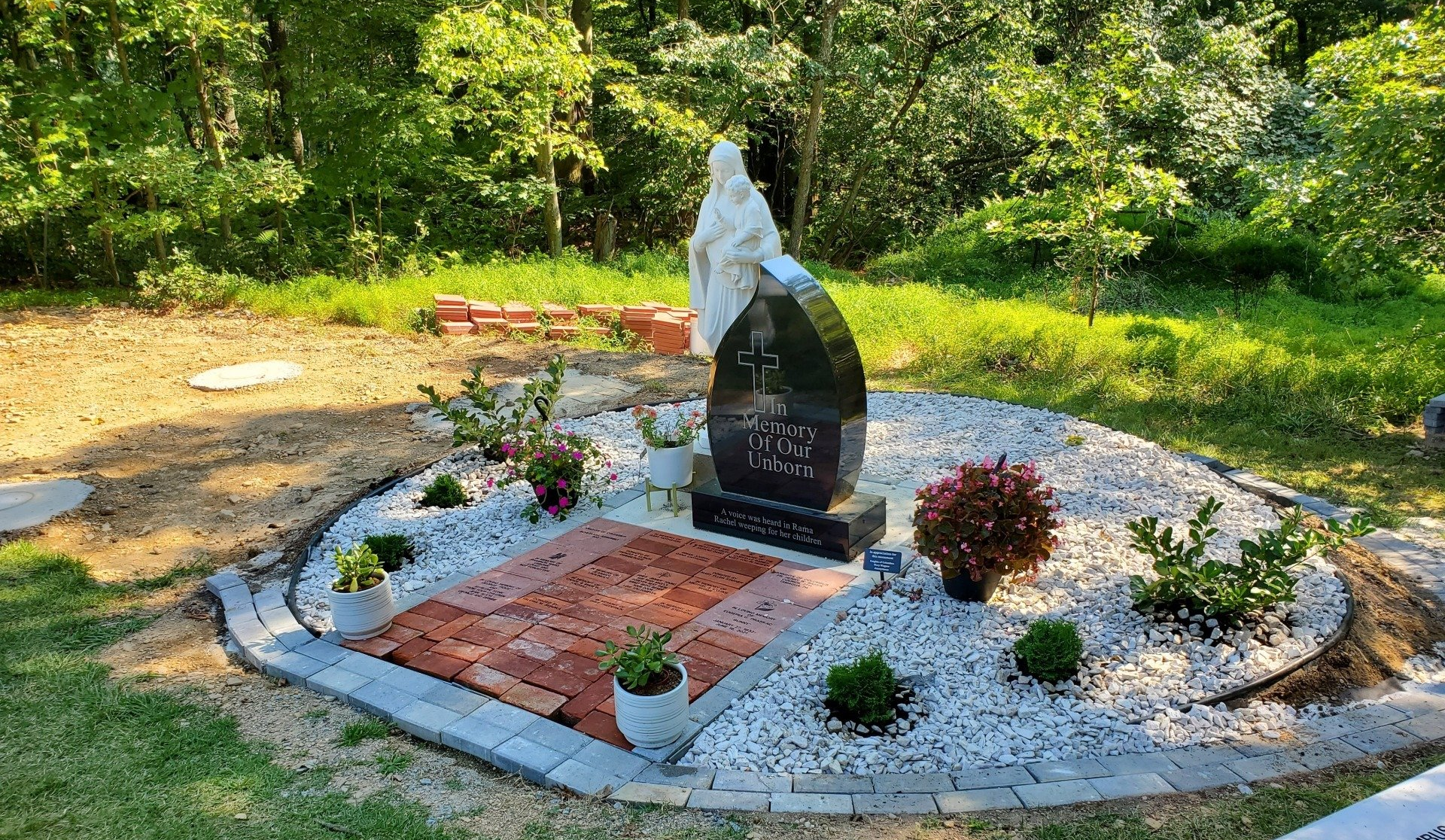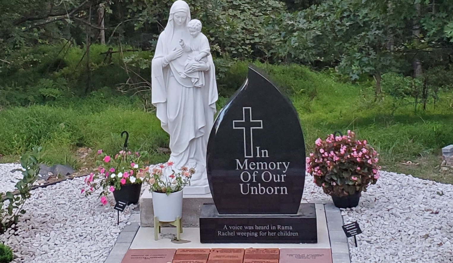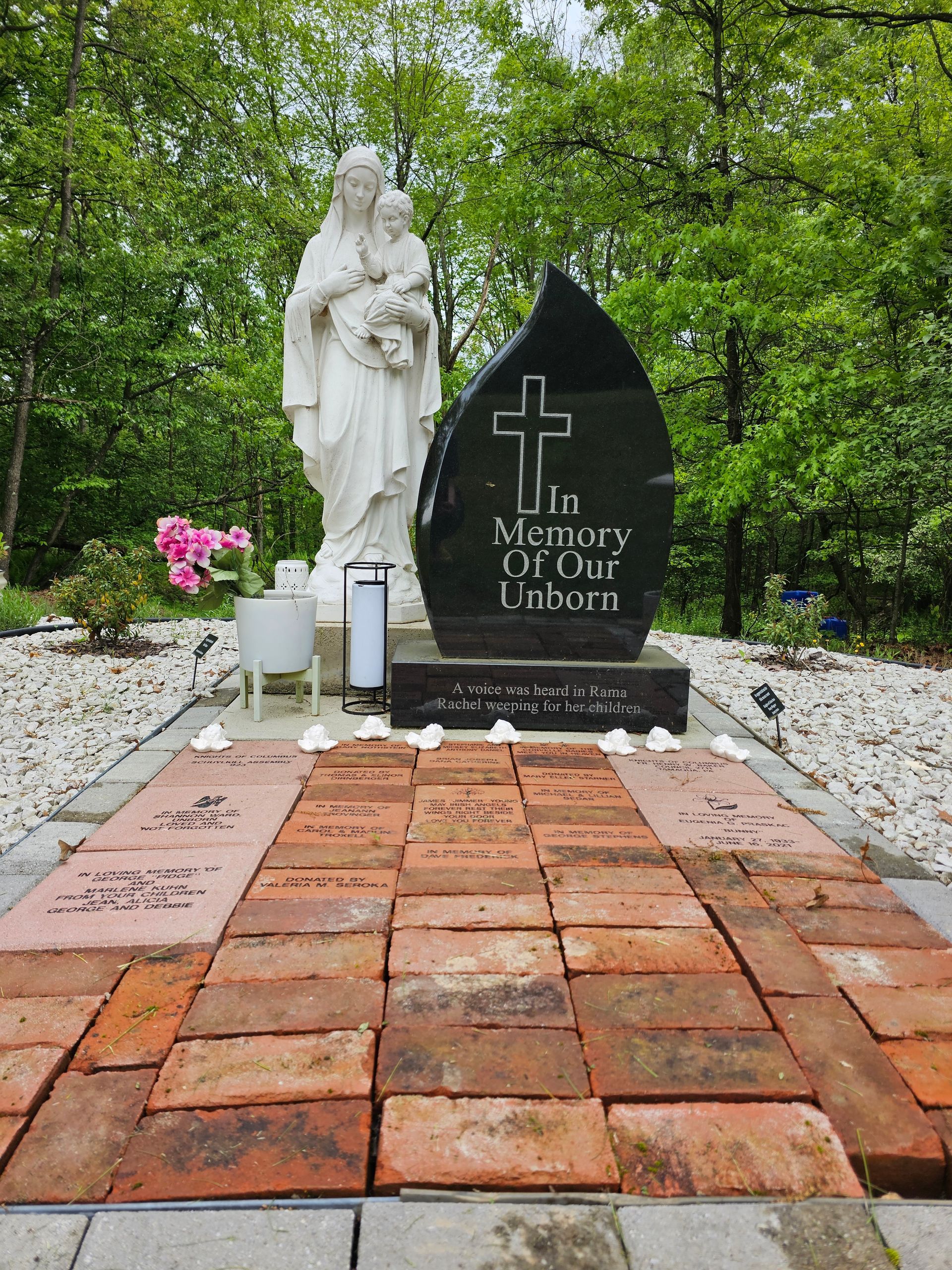 A beautiful monument for aborted children is the center of this section, surrounded by an area of evergreens that symbolize eternal life, with a backdrop of woods. This area was designed to honor lost loved ones.