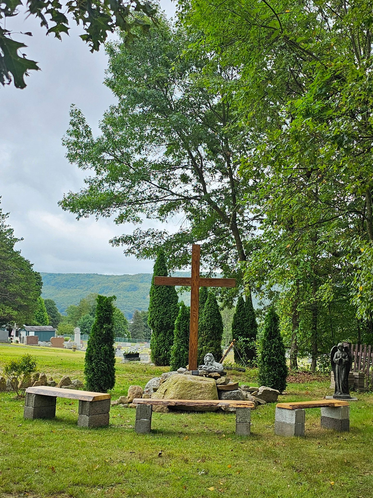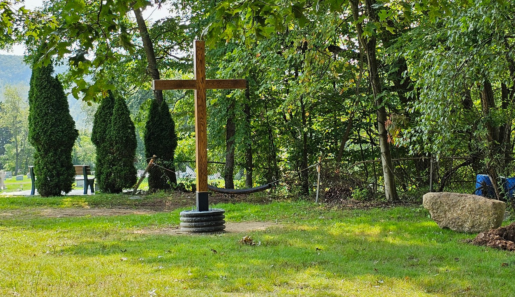An 8 foot cross, surrounded by a boulder "mountain" with a shrub backdrop and four benches will create a perfect place to leave your worries, offer your sufferings, surrender, reflect on Jesus, and pray.