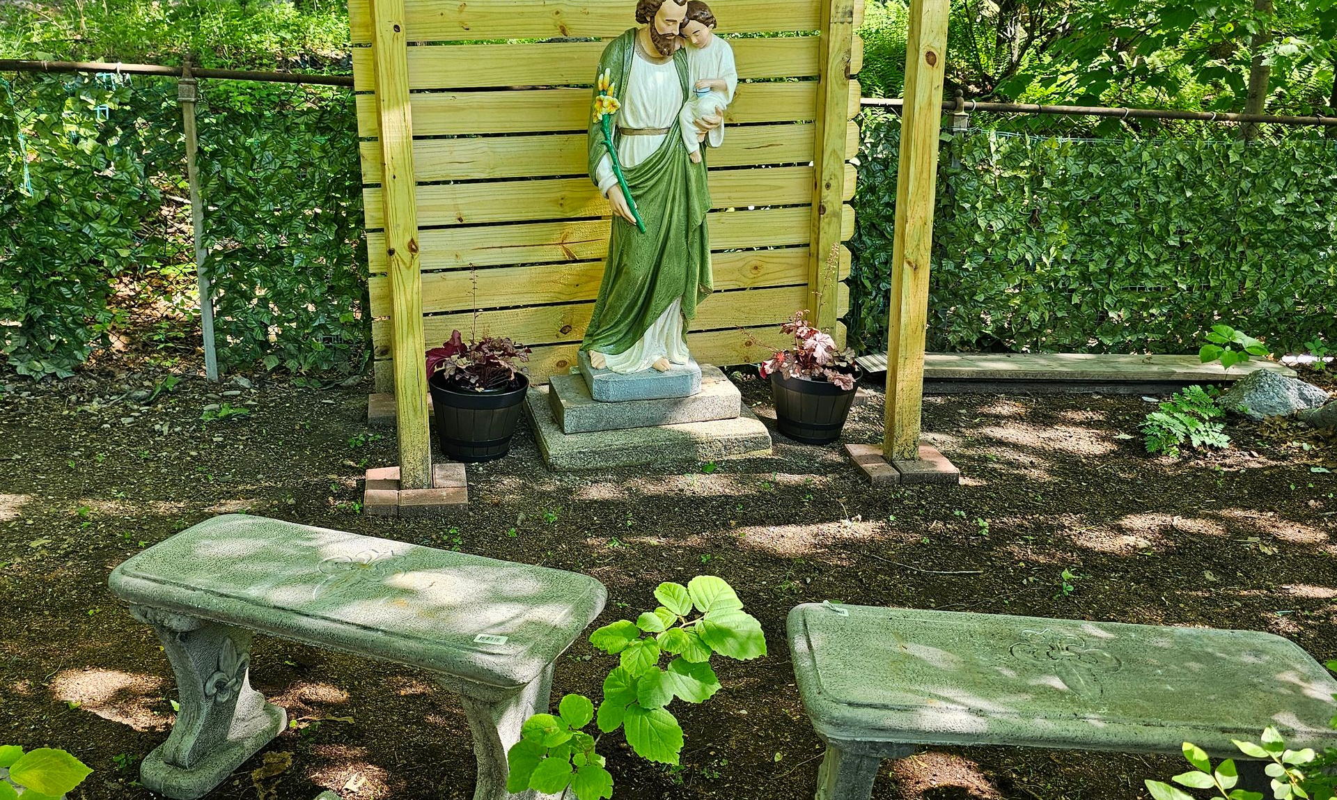 A short rock-lined path leads to a little nook in the brush, to the side of the Prayer Gazebo, where you can sit and pray in solitude with St. Joseph.