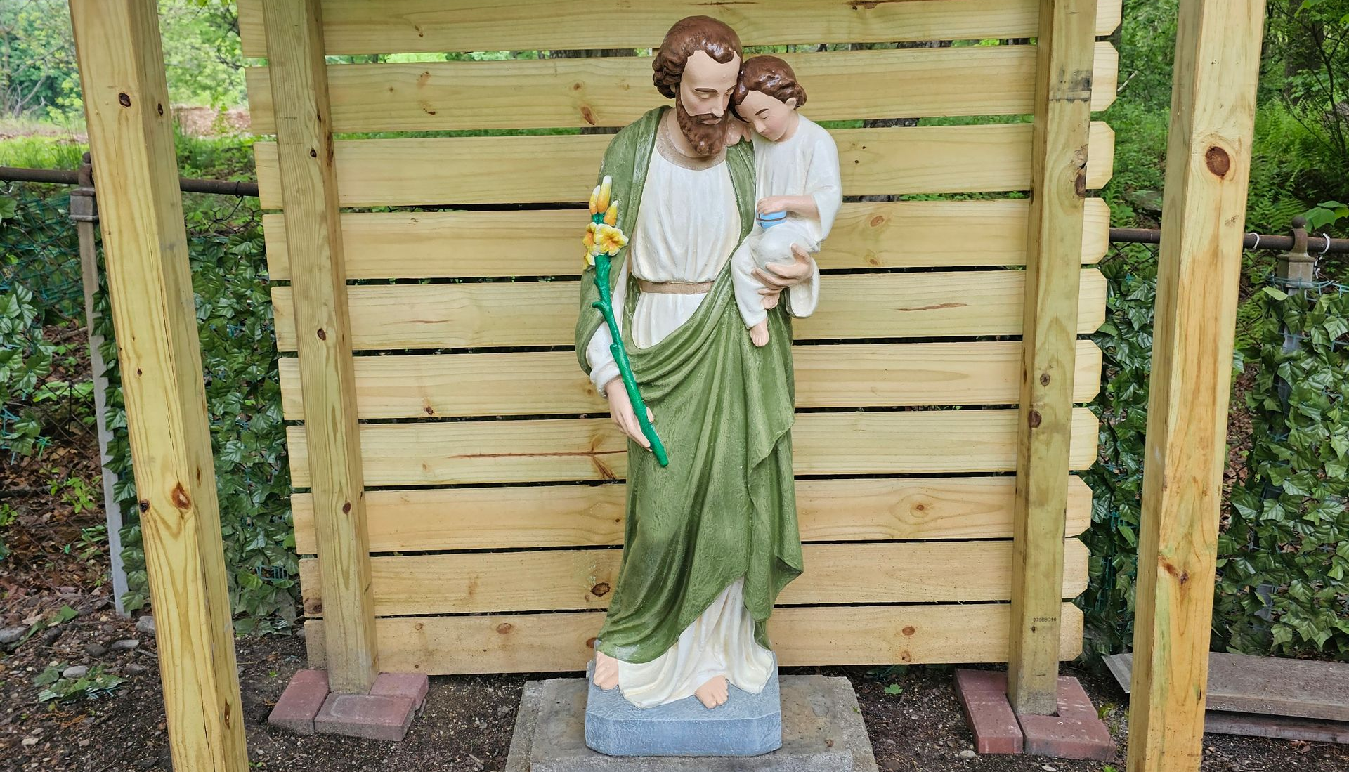 This is a small, private place behind the brush and trees where you can be alone and feel the hug of God when you are feeling overwhelmed, insecure, or hurting. Or where you can talk to St. Joseph, request intentions, and feel the strength and faith of the foster-father of Jesus.